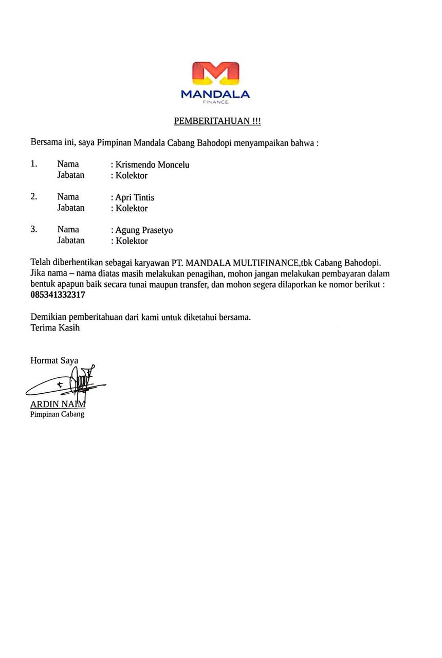 Menyikapi kasus ini, pihak PT. Mandala Multifinance Bahodopi telah mengeluarkan edaran resmi kepada masyarakat. Dalam edaran tersebut, perusahaan memperingatkan konsumen untuk tidak melayani tiga mantan karyawan yang sudah diberhentikan, yakni AP, KM, dan AT. Pihak perusahaan menegaskan agar masyarakat tidak melakukan pembayaran tunai atau melalui transfer jika ditagih oleh mereka.